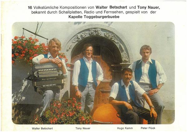 Im Jahre 1967 erfolgte die Gründung der Kapelle 'Toggeburgerbuebe' durch die beiden Akkordeonisten Walter Betschart und Walter Ammann sowie dem Bassisten Hugo Kamm. 1969 wanderte der Akkordeonist Walter Ammann nach Australien aus. Mit dem talentierten Tony Nauer konnte ein ebenbürtiger Ersatz gefunden werden. Die beiden Akkordeonisten Nauer - Betschart haben zusammen über 70 Titel auf Tonträger eingespielt, die immer noch oft im Radio zu hören sind. Am Klavier spielte am Anfang Willi Zimmermann, 14 Jahre lang Peter Flück, gefolgt von Franz Mettler und später Erich Gisler. Den Bassbegleit übernahm am Anfang Hugo Kamm, der 1984 vom Köbi Schiess abgelöst wurde. 1992 verliess Tony Nauer die Toggeburgerbuebe und wurde während 7 Jahren vom Reichenburger Multimusikant Xaver Kistler ersetzt. 2009 haben Tony Nauer und Walter Betschart beschlossen, wieder miteinander zu musizieren. Ein alter Musikvirus hat die Beiden befallen und ein musikalischer Kreis hat sich wieder geschlossen. Die Toggeburgerbuebe musizieren wieder mit Tony Nauer, Walter Betschart an den Handorgeln, Erich Gisler am Klavier und Köbi Schiess am Bass. im Mai 2018 wird Tony Nauer erneut von der " Nervenhexe" geplagt. Er hat in der rechten Hand grössere Probleme.Objekte