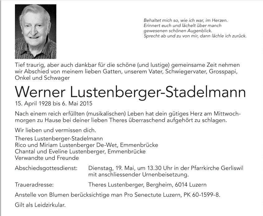 Akkordeonist, wuchs in Littau auf und lernte 1947 bei Harry Meier in Emmenbrücke das Spiel auf der Klavierhandorgel. Ansporn dazu hatte er von seinem Vater, einem Schwyzerörgeler, sowie seinem älteren Bruder, dem Klarinettisten Emil Lustenberger, erhalten. Die Grundzüge der Harmonielehre brachte ihm Sepp Gmür aus Rüti im Kanton Zürich bei. Die ersten Proben seines Könnens gab er als Partner seines Bruders und des Akkordeonisten Kaspar Landolt (* 1924) ab. Letzterer bildete mit ihm zur selben Zeit, in der ersten Hälfte der fünfziger Jahre, ein Handorgelduett mit Klavierbegleitung. In diesem Fach erlangte Werner Lustenberger anschliessend an der Seite von Köbi Buser und darauf mit Tonv Roos, nachdem dessen Kapelle Aregger-Roos aufgelöst worden war, einen beachtlichen Bekanntheitsgrad in der Region Luzern. Seine Spielorte waren jahrelang abwechselnd die einstigen Konzertlokale der Leuchtenstadt wie «Reusssteg», «Reussfähre» und «Steinbock». Albert Hagen und Franz Feierabend nacheifernd, erwarb er sich auf dem spieltechnisch anspruchsvollen Pianoakkordeon schon früh den Ruf eines Klassespielers, was ihm an manchen Wettspielen, die er im ersten Rang abschloss, bescheinigt wurde. 1950 nahm die Schallplattenindustrie erstmals von ihm Notiz und verpflichtete ihn zusammen mit Kaspar Landolt für Aufnahmen zu 78.Touren-Schallplatten. Bis 1985 sollte er gar 80 Tonträger bespielen, worunter u.a. mehrere mit Walter Grob und seinem bevorzugten Klavierbegleiter Föns Lustenberger. Die rund 30 Eigenkompositionen, herausgegeben von den Verlagen Feldmann und Lustenberger, hat er bei zahlreichen Radio- und Fernsehsendungen sowie Auslandkonzerten in Paris, Holland, Deutschland und den USA dargeboten. Der Musik dient er weitgehend auch als gelernter Kaufmann im beruflichen Alltag. So befasst er sich seit über drei Jahrzehnten mit dem Plazieren und dem Unterhalt von Musikautomaten in Gaststätten unter Mithilfe seines Bruders.Objekte