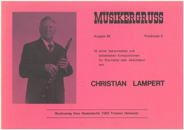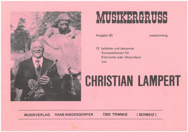 Klarinettist, aufgewachsen als Spross einer neunköpfigen, in einfachen Verhältnissen lebenden Familie in einem abgelegenen Blockhäuschen an der Bahnstrecke Maienfeld-Chur oberhalb Maienfeld. Sein gleichnamiger Vater versah hier den Dienst eines Bahnwärters bei der SBB, unterhielt zugleich einen kleinen Landwirtschaftsbetrieb und dirigierte als Trompeter die Stadtmusik Maienfeld. Mit dessen Unterstützung erlernte der junge Lampert während seines ersten Schuljahres das Handorgelspiel, worin er es im Selbststudium bis zur vierten Klasse schon so weit gebracht hatte, dass er einmal gar die Produktionen einer Seiltänzergruppe begleiten durfte. Nach neunjähriger Schulzeit arbeitete er bis zum vierundzwanzigsten Lebensjahr auf dem elterlichen Heimwesen, half zeitweise im Bahndienst aus und war anschliessend von 1926 bis 1956 im Rebbau auf dem weitläufigen «Marschallgut» in Maienfeld tätig. Mit dem Schulaustritt begann auch seine fünfzigjährige Musikantenlaufbahn, bald als Trompeter in der örtlichen Musikgesellschaft und späteres Aktivmitglied der «Harmonie» Bad Ragaz, bald als Schwyzerörgeler von 1918 bis 1924 bei Hochzeiten und sonstigen Festlichkeiten. Nachdem er 1924 zur Klarinette gelangt war, mit der er sich in der von ihm bevorzugten Ländlermusik besser durchsetzen zu können glaubte, gründete er 1926 im Verein mit seinem Bruder Peter an der Bassgeige und dem Sarganser Akkordeonisten Martin Broder, später nacheinander abgelöst durch Rinaldo Tormenti und Andreas Haltiner, die bis 1975 bestehende Kapelle «Falknis». Diese Formation bestritt vorab in Graubünden und im St. Galler Rheintal über 1300 Freinächte und kehrte von manchen Wettspielen, wie jene von Wädenswil, Wollerau und Zürich-Altstetten, mit Kranz und Becher heim. Ihre Musik, meist Eigenkompositionen von Christian Lampert, so der «Trümeli»-Marsch oder der Walzer «Der verlorene Bassgeiger», ist auf rund 30 Schallplatten, entstanden von 1937 an, festgehalten. Während Lampert seine Fähigkeiten als Klarinettist in der volkstümlichen Tanzmusik bewies, nutzte er seine Fertigkeit im Handorgelspielen schon frühzeitig für den Unterricht. Seine 1934 gegründete Handharmonikaschule in Maienfeld mit Zweigstellen in den umliegenden Orten, die er jahrzehntelang leitete, trug wesentlich zur Verbesserung seines bescheidenen Einkommens eines Weinbauers und zuletzt Reisenden in Haushaltartikeln bei. Dass er über gute Kenntnisse in der Notenschrift verfügte, die er sich ohne fremde Hilfe angeeignet hatte, belegen seine Alben mit rund 100 Bündnertänzen, herausgegeben im Eigenverlag. Er lebte noch in den 1980er Jahren in Maienfeld.Objekte