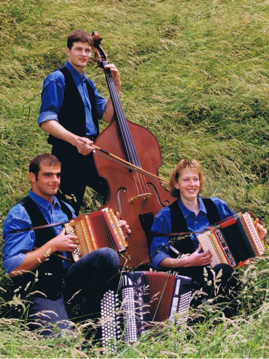 Instrumentale Besetzung? Schwyzerörgeli, Akkordeon, Kontrabass. Wie kam es zur Formationsgründung? Evtl.: Warum wurde die Formation aufgelöst? Die Formation ging aus der Kindertanzmusik der Trachtengruppe Lungern hervor. Nach der Auflösung dieser Formation hatten die Mitglieder den Wunsch, weiterhin miteinander zu musizieren. Zuerst trat man unter dem Namen „Echo vom Lungerersee“ mit einer etwas anderen Besetzung auf. 1993 entstand dann das Echo vom Sunnätag, welches über 15 Jahre Bestand hatte. Der erste Auftritt war an einer Geburtstagsfeier. Die Formation wurde 2007/8 aufgelöst. Ursi Gasser und André Wolf hatten inzwischen geheiratet und waren bereits Eltern von zwei Kindern. So ging es zeitlich nicht mehr gut auf und es gab keine Auftritte mehr. Welches sind/waren die Gründungsmitglieder? Welche Musikerinnen und Musiker sind/ waren Formationsmitglieder? Zeitraum der Mitgliedschaft? • Glois Imfeld (Stocki-Glois), Akkordeon und Schwyzerörgeli, 1993 bis 2008 • Wolf-Gasser Ursi (Summerweiders), Schwyzerörgeli, 1993 bis 2008 • Wolf André (Ehemann von Ursi), Kontrabass 1993 bis 2008 • von Büren-Imfeld Irene (Wiiders), Schwyzerörgeli, 1993 bis ca. 1996 Vorbild-Formationen? Iten-Grab, Stockbergbuebe. Besonderheiten in der Spielart? Gibt es z.B. eine bevorzugte Stilrichtung (z.B. Illgauer-, Berner-Stil, konzertante Musik, Stimmungsmusik usw.)? Innerschwyzer Stil und ein paar Stimmungslieder. Bei welchen Anlässen spielt(e) die Formation mehrheitlich auf? Bei verschiedenen Festen, auch an Älplerchilbenen, an der Fasnacht, bei Jodlerkonzerten, an Geburtstagen etc. Gibt es Auftritte, die bei der Formation einen besonderen Stellenwert haben? Irgendwie war jeder Auftritt etwas Besonderes; man durfte viele gute Bekanntschaften und Freundschaften schliessen. Wie viele Auftritte hat(te) die Formation durchschnittlich pro Jahr in der aktivsten Zeit? Wann war diese Zeit? In der aktivsten Zeit waren es jährlich zwischen 12 und 15 Auftritten. Gibt es Tonträger oder Radioaufnahmen? CD Power 2000 (mit fünf Formationen aus den Kantonen OW/NW). Gibt es Fernseh- oder eigene Filmaufnahmen? Auftritt in der Sendung Hopp dr Bäsä.Objekte