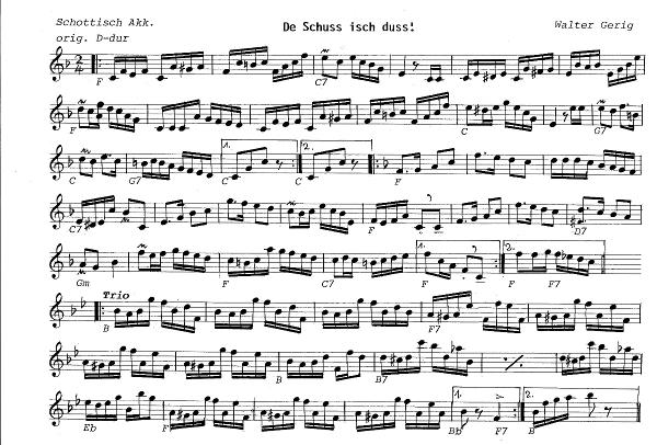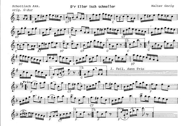"Wo bist du aufgewachsen? Wo ist dein gegenwärtiger örtlicher Lebensmittelpunkt? • bis 1952 auf der Göscheneralp • ab Oktober 1952 - 1962 in Kägiswil • 1962-1985 in Olten Luzern und Kriens • ab 1985 wieder in Kägiswil Gelernte(s) Instrument(e)? Was spielst du regelmässig bei deinen Auftritten? „Muilörgeli“ , diatonische Handorgel, Akkordeon, Schwyzerörgeli, Kontrabass. Ich spiele regelmässig Akkordeon. In welchem Alter, wo, bei wem hast du gelernt? Mit 14 Jahren erlernte ich auf der diatonischen Handorgel zu spielen und mit 17 Jahren kam dann das Akkordeon dazu. Ich habe autodidaktisch gelernt und kenne keine Noten. Die Musikanten, die mir das Spiel auf dem Akkorden beibringen wollten, hatten keinen Erfolg, weil alle „rückwärts“ chromatische Akkordeons spielten. Warum wolltest du Volksmusik spielen? Es machte mir Freude und Spass und auch mein Vater war ein „Örgeler“. Wann und wo (bei welchem Anlass) hattest du deinen ersten öffentlichen Auftritt? 1960 spielte ich mit meinem Bruder Klemenz in Kägiswil im Restaurant Adler bei einer Hochzeit. Mit wem spielst du gegenwärtig regelmässig zusammen? Namen? Besetzung? Namen der Formation(en)? Mit Hubi Wallimann und Hermi Michel: Record-Akkordeons, Schwyzerörgeli und Kontrabass. Wir nennen uns Obwaldner Ländlertrio. Hast du schon früher regelmässig in Formationen mitgewirkt? Namen der Formation(en)? Zeitraum (von-bis)? Namen der MitspielerInnen? Besetzung? • 1963-1978: Sunnehuisli Alpnach: Sepp und Edy Wallimann (klar/sax), Klemenz und Walter Gerig (akk) • ab 1978-1983: Sepp Wallimann (klar/sax), Walter Gerig (akk), Isabelle Schürmann (p) und Hermann Michel (kb) • ab 1983-1990: HD Gebr. Gerig (akk) , Gander Chaschbi jun. (p) und Hermann Michel (kb) • ab 1986-2015: Begleitung von Jodel-Duetten: Ruth Rymann-Ernst Jakober und Geschwistern Annemarie und Silvia Rymann sowie, wenn Not am Mann war, deren Vater Ruedi Rymann • ab 1990-1997: Kapelle René Jakober, Stalden: anfänglich mit René Jakober (klar/sax), Walter Gerig (akk), Armin Michel (p), Hermann Michel (kb), später mit Albert Stöckli (p), oder Alois Schilliger (p), Oski della Torre jun. (kb) oder Peter Gisler (kb) • ab 2003-2017: Handorgelduett Walti Gerig-Turi Schuler mit Heidi Michel (p) und Hermann Michel (kb) • Turi ist leider am 17. August 2017 nach einer Stubetä in Alpnach verstorben (Herzinfarkt). • Seit 2005 begleite ich das Schwanderchörli (Seniorenchörli) musikalisch. Hast du musikalische Vorbilder? Wenn ja, welche sind das? Jeder, der gepflegte Musik macht, ist mir ein Vorbild! Gibt es Besonderheiten in deinem Repertoire? Gibt es z.B. bevorzugte Komponisten, Taktarten? Ich suche mir Titel, die mir ins Gehör passen, von verschiedensten Komponisten aus, egal ob Polka, Schottisch oder Ländler. Es gibt ja so tolle Titel, da ist das Komponieren fast überflüssig. Gibt es Besonderheiten in deiner Spielart? Gibt es z.B. eine bevorzugte Stilart (z.B. Illgauer-, Berner-Stil, konzertante Musik, Stimmungsmusik usw.)? Spielst du mehrheitlich vor oder begleitest du lieber? Ich kann mich eigentlich allen Musikanten, die einen gepflegten Vortrag und Stil haben, gut anpassen. Musik kennt bekanntlich keine Grenzen! Vorspiel, zweite Stimme oder Akkord-Begleitung ist mir egal. Bei welcher Art von Anlässen bist du mehrheitlich am Spielen? Volkstümliche Stubeten, private und sonstige kleinere Anlässe. Gab es schon Auftritte, die einen besonderen Stellenwert für dich haben? Es sind vor allem die Auftritte mit besonderen Musiker-Persönlichkeiten: • als 18-jähriges Greenhorn mit Köbi Buser sen. im Reusssteg in Luzern • mit Josef Feierabend im Wasserfall Engelberg, • mit Hans und Oski della Torre sowie mit Walter Grob in der Alpenrose Kriens • nicht zu vergessen - der Überraschungsauftritt mit Ruedi Rymann bei Bundesrat Samuel Schmid zu seinem 60. Geburtstag. Auch die Auftritte als Notnagel (Aushilfe), notabene ohne, resp. wenigen, Proben bleiben für mich sicher unvergesslich, besonders, weil das immer spannende Momente waren. Ich spielte so z.B. mit (um einige zu nennen): Fritz Dünner, Franz Bühler, Sebi Heinzer, Peter Steudler, Röbi Wicki, Richi Rogenmoser und auch mit meinen Verwandten, der Familien-Kapelle Gehrig aus Andermatt. Gibt es interessante, lustige Episoden aus deinem musikalischen Leben? Oh - da gibt es viele in dieser so langen Zeit. An eine der frühen Geschichten erinnere ich mich noch genau: Wir spielten an einem Jodlerabend im Kanton Aargau. Nach dem Auftritt ging es zum Präsident des Jodelklubs nach Hause zu einem oder zwei ?? Kaffees. Wir interessierten uns überdies für seine zwei hübschen Töchter. Als wir erst mittags wieder daheim aufkreuzten und den Eltern über den Grund der Verspätung Auskunft geben mussten, war eine der ersten Fragen: „Sind denn diese Mädchen eigentlich katholisch??“ Das waren die beiden Aargauerinnen leider nicht! Hast du schon Auszeichnungen, Ehrungen, Preise gewonnen? Wenn ja, welche? Mit der Kapelle Sunnehuisli konnten wir die „Heirassa-Glocke“ entgegen nehmen."Objekte