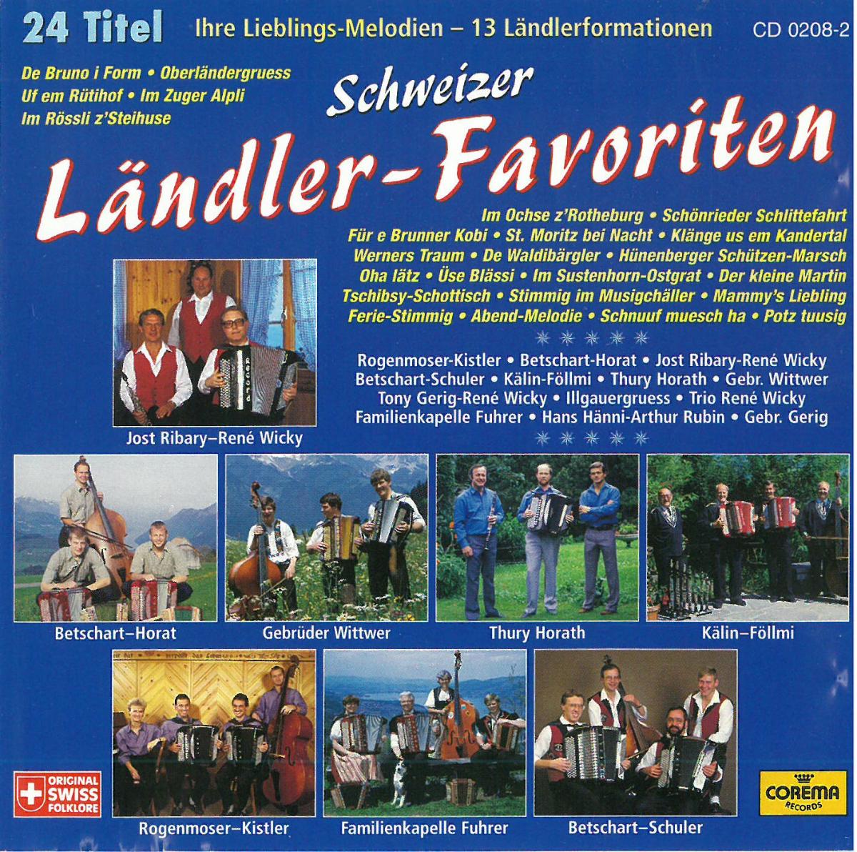 Schweizer Ländler-FavoritenIhre Lieblings-Melodien - 13 LändlerformationenCOREMA Records, LabelKapelle Jost Ribary-René Wicky, Interpret:inHans Hänni, Interpret:inHandorgelduo Gebrüder Gerig, Interpret:inLändlertrio René Wicky, Interpret:inArthur Horath, Interpret:inHandorgelduo Betschart-Schuler, Interpret:inKapelle Illgauergruess, Interpret:inFamilienkapelle Fuhrer, Interpret:inKapelle Rogenmoser-Kistler, Interpret:inHandorgelduett Betschart-Horat, Interpret:inGebrüder Wittwer, Interpret:inLändlertrio Hans Hänni-Arthur Rubin, Interpret:inKapelle Kälin-Föllmi, Interpret:inTony Gerig - René Wicky, Interpret:inInventarnummerCD 929 Datierung1983 - 2002GattungTon-/Bild-/Filmträger