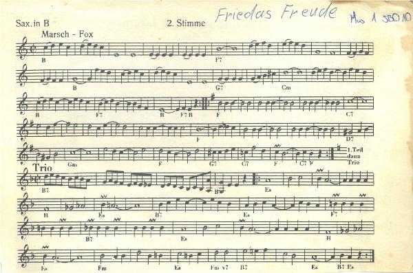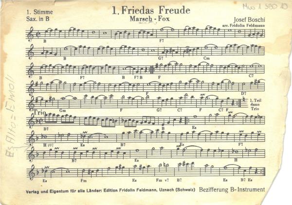 Open in new tabOpen in new tabOpen in new tabOpen in new tabFriedas Freude, Marsch-FoxVerlag Fridolin Feldmann, Verleger:inSepp Boschi, Komponist:inFridolin Feldmann, Arrangeur:inInventarnummerMus 1 SBO 10 Gattungeinzelnes NotenblattBesetzung1. Stimme Saxofon in B